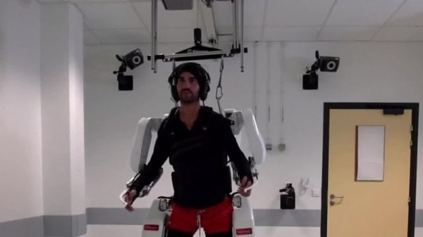 The 28-year-old quadriplegic patient, known only as Thibault, used a system of sensors implanted near his brain to send messages to move all four of his paralysed limbs of the exoskeleton which was attached to a ceiling harness to help him balance.